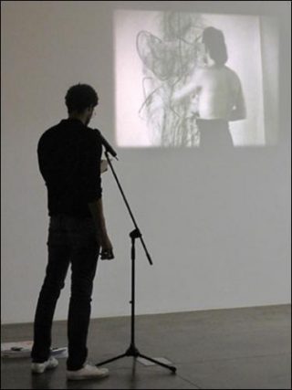 Dans l’espace bipartite dévolu aux expositions satellites, l’installation s’est faite bipolaire. Face à face, mais invisible l’une de l’autre, deux vidéos présentent chacune une performance de l’artiste. En haut, Paramètres: assis à une table face à la caméra, l’artiste dit un texte, qui parle de structures et de dérèglements, et lui donne une visibilité matérielle en ajustant aux contours de son visage des découpages de plans d’architecte, comme une série de modélisations géométriques qui produiraient de nouveaux pictogrammes: «La forme du texte contraint les mouvements», dit l’un d’eux.