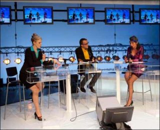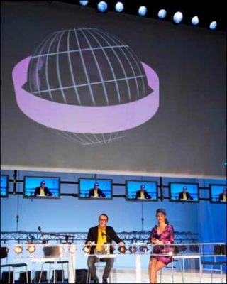 Pour cette célébration en grandes pompes, elle transforme la scène en plateau télé grandeur nature, écrans, coulisses et techniques apparents. Le public pénètre in medias res le dispositif scénique par lequel il se transforme, à son insu, en téléspectateur. L’action est mollement entamée: l’équipe technique s’affaire, le cameraman opère les derniers réglages, la styliste s’occupe de la garde-robe, le présentateur révise ses fiches, la première invitée se fait maquiller. Bien que plus proche du câble que des chaînes hertziennes, ce décor immersif et dépaysant renforce le brouillage des frontières entre vérité et fiction, documents d’archive et artifices.