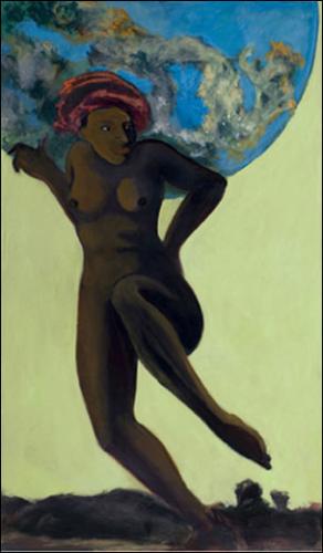 Voyez cette «Porteuse de monde» noire non pas pour plaire à l’air du temps mais parce que c’est l’origine. Dès l’origine, innommable, innomée, l’homme porte le monde, nouvel Atlas, pour son malheur et sa gloire. Il le porte parce qu’il le dit. Qu’il le raconte, qu’il en fait une histoire. Et qui la première raconte l’histoire? C’est elle, la femme.