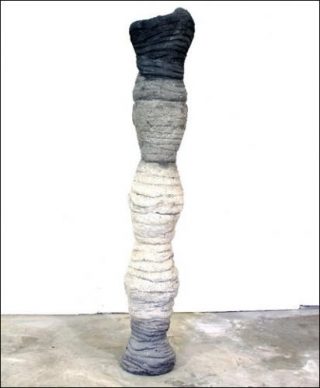 Chacun des Nœud explore ses formes labyrinthiques, ses qualités sculpturales et son matériau fascinant — un mélange de ciment, de papier mâché et de pigments utilisé pour fabriquer des briques à faible coût. Ils se jouent d’une confrontation avec leurs socles avec lesquels ils ne semblent faire qu’un, absorbés. À l’image de l’œuvre Vache (2000), lointaine cousine issue des premières années de création de l’artiste, ou des Colonnes (2013), vampirisation de la Colonne sans fin de Constantin Brancusi (1938) rabattue à une taille humaine et à un matériau agraire — l’hypertufa, un alliage de ciment, de sable, de gravier et de tourbe, utilisé en horticulture ou dans l’architecture rurale.