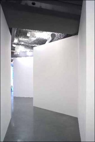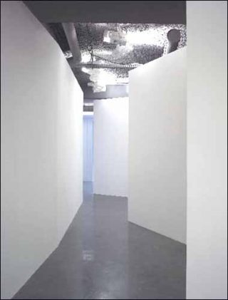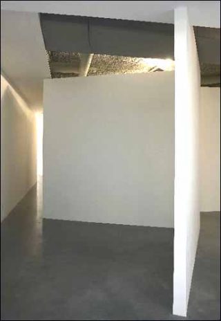 A peine avons-nous poussé la porte de la galerie Frank que nous sommes rejetés à la périphérie de son habituel espace de circulation. Le nouveau dispositif de Laurent Pariente nargue ainsi le visiteur, le faisant patiemment contourner des murs blancs avant de l’introduire, par une ouverture située à l’exact opposé de l’entrée de la galerie, dans un nouvel espace.