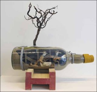 — Horizon moins vingt, 2008. Bouteille en verre 4,5 L terre, ficelle, os, pierre, coquilles d’escargot, racine, divers matériaux et vidéo couleur sonore. 50 x 35 cm et 22 min 45.