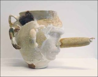 — Horizon moins vingt, Vase, 2008. Divers tessons en provenance du tunnel, gravure sur terre et résine et petites figurines. 40 x 23 x 23,5 cm