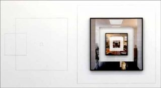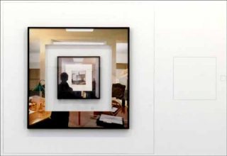 De sorte que cet entonnoir visuel aspire le regard vers le point de fuite central, où il bute sur un chevalet vide, ou bien, évidé d’un ultime carré, ouvert sur le mur ou obturé par un gris neutre. L’œuvre fuit, s’absente obstinément, pour mieux cerner le spectateur qui en devient le centre, au risque d’être happé, comme le suggère une silhouette, vue de dos, prisonnière de l’un des cadres.