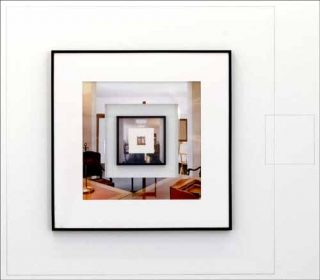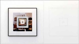 Au centre de chacun des quatre murs de la galerie, un cadre noir carré, dans lequel s’emboîtent, concentriquement et alternativement, des photographies — des vues de l’atelier de l’artiste, murs blancs et fauteuils tapissés —, et des carrés blancs: chacun évide l’image qui l’entoure, et encadre celle qu’il contient.