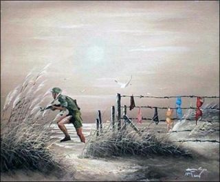 Nguyen Manh Hung poursuit sa série «Readymade paintings» (2013) entamée au Vietnam. Il y questionne le concept de copie et de production en série de peintures de paysages en Chine, puis au Vietnam. Il peint ses propres personnages (autoportraits, soldats…) sur les toiles qu’il achète au hasard de ses pérégrinations.