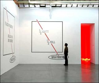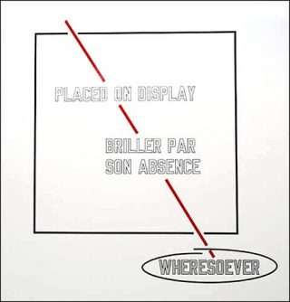 1/2 Empty-1/2 Full. De quoi nous parle-t-on ? Les inscriptions en lettres argentées sont encadrées de rectangles vides. Les diagonales qui les coupent en deux impliquent un sens de lecture descendant. Le regard est guidé de haut en bas jusqu’à des mots «Whatsoever», «Whensoever», «Wheresoever», «Howsoever» qui semblent vouloir répondre à nos interrogations devant tant de mystère.