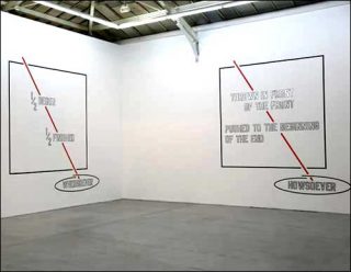 «Lorsque je présente une oeuvre avec des mots, explique Lawrence Weiner, cela comprend les associations propres à la langue, les doubles sens, et l’indication des matériaux. Le travail, la pièce, c’est seulement la langue, les mots, plus tous les matériaux auxquels il est fait référence».