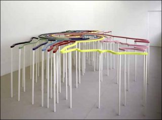 L’œuvre se présente comme un gigantesque tourbillon nourri par l’apport d’affluents et supporté par des pilotis. Impression de mouvement, de vitesse et de bruit. Forme intrigante, elle noue un dialogue singulier avec le corps du spectateur et avec l’espace de la galerie : elle fonctionne vis-à -vis d’eux tout en les excluant.