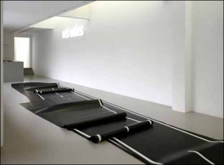 Le ton est donné avec Eyeliner, cette route pesante de 50 mètres qui se déploie dans l’espace d’exposition, qui vient s’y confronter, se heurter aux murs, s’y adapter aussi, modulable à souhait.