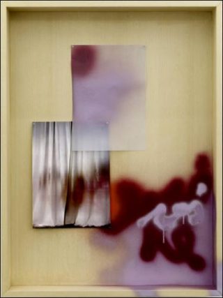 — Jimmy Robert, Sans titre, 2010. Tirage jet d’encre sur papier Archivé, cadre en MDF et Multiplex plaqués hêtre, papier coloré, calque, peinture en spray, 80 x 60 x 11 cm