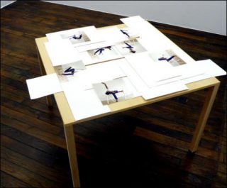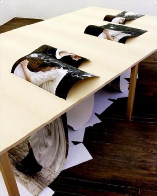 La première installation se présente sous la forme d’une table sur laquelle sont réparties de grandes photographies. Grâce à un système de fentes, les images peuvent circuler librement sur et sous la table. Gondolé, retroussé, pendu dans le vide, le papier initie des mouvements. L’ensemble semble vivant et dans un état transitoire. Les grandes photographies représentent, dans différentes postures, la danseuse Shiho Ishihara, que l’artiste a rencontrée pendant une de ses expositions au Japon. Seulement suggérée par des images, la chorégraphie reste silencieuse et désincarnée, comme mise à distance.