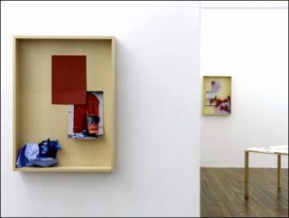 Dans la seconde salle, une surface creuse en bois confronte trois éléments en papier qui traduisent tous à leur manière une source commune. D’abord, une photographie restitue un objet réel, un rideau de scène par exemple. Puis, une feuille de papier en isole la couleur exacte. Enfin, une troisième action en interprète la consistance, par le froissement d’une feuille par exemple.