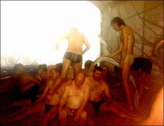 Le samedi 9 novembre n’a pas dérogé à la règle, car la galerie faisait salle comble. Moment unique, elle était transformée en piscine, avec son vestiaire et sa salle d’eau. Plus proche du sauna, le jeu consistait à aller se baigner dans une marée humaine. Le bassin était composé de dix personnes opulentes — spécialement requises pour l’occasion — imbriquées les unes aux autres. Le spectateur était invité à se déshabiller et à aller se baigner, c’est-à -dire se coller aux autres participants. La salle était recouverte du sol au plafond d’une bâche en plastique qui collait les baigneurs.