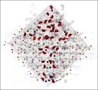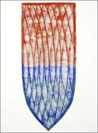 Les boucliers, structures en croisillons couvertes de dépôts de pigments séchés sont un écho lointain de son fameux Châssis avec feuille de plastique tendue (1967), Å“uvre maîtresse qui fut à l’origine de son engagement dans le mouvement Supports/Surfaces.