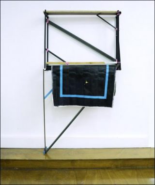 Thomas Klimowski présente également l’œuvre Fauves et flore, une structure en bois d’où s’échappe des fils de laine et une corde de lin colorés. Elle évoque à la fois l’aspect d’une sculpture minimale, d’un meuble aux tiroirs ouverts, ou encore d’un métier à tisser.