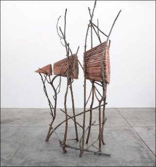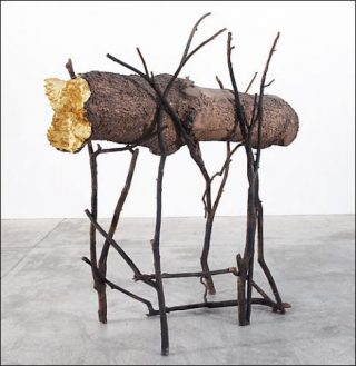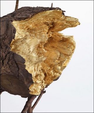 Par là , les deux immenses troncs apparaissent comme deux tombeaux soulevés par les bras des endeuillés, lors d’un cortège funèbre. Les troncs sont d’ailleurs réalisés en bronze qui, suite à une oxydation, a épousé la couleur même du végétal, alors que la cassure a été recouverte d’une couche dorée, brillant ainsi d’un bel éclat. La dorure se fait le pendant du lugubre et du funéraire, soulignant que toute forme de vie abrite en elle-même une lumière, un souffle, comme le tronc qui, quoique brisé, reste traversé par la sève.