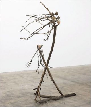 Dans la grande salle de la galerie, nous retrouvons deux sculptures imposantes, reposant toutes deux sur un assemblage de branches de bronze. Tra… représente ainsi un grand tronc d’arbre à l’horizontale, brisé en deux parties. L’originalité de Tra… consiste alors à inverser le rapport entre le tronc et ses branches, puisque désormais ce sont celles-ci qui soutiennent celui-là , tout en montrant le lien indéfectible qui les unit.