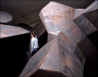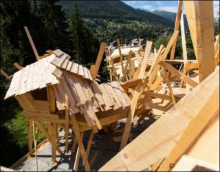 A La Maréchalerie, les Frères Chapuisat s’inspirent de la charpente prégnante du lieu pour l’investir d’une structure envahissante et massive. Le visiteur se retrouve face à face avec un château de cartes en chêne, une archi-sculpture autoportante qui révèle les forces architecturales de l’espace. Si les artistes avouent leur passion pour un certain brutalisme, le choc artistique que provoque la vue de leurs installations est tout autant émerveillé que périlleux; car selon Mireille Descombes «l’exploration est grisante, mais pas totalement sans danger. L’art des Chapuisat n’est pas une place de jeux».