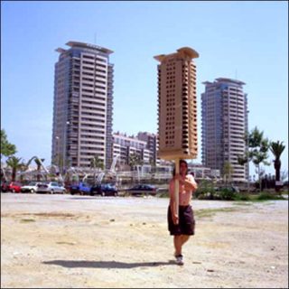Mais voilà , lorsque le film s’achève, nous sommes revenus au point de départ. Architectures trompeuses, littéralement impossibles : il est fréquent, dans l’œuvre d’Escher, que l’on monte ou descende des dizaines de marches sans jamais accéder à un quelconque niveau supérieur ou inférieur; de façon semblable, on monte ici d’étage en étage sans pouvoir gagner les hauteurs. Le mouvement ascensionnel ne mène pas aux cieux, et la structure circulaire de l’installation — la boucle filmique — transforme l’idée de rédemption en une attente perpétuellement reconduite. Je précise encore ceci que, pendant que les hommes dorment, un être apparaît au fond du plan (alpiniste? laveur de vitres?), en train d’escalader paisiblement une échelle…