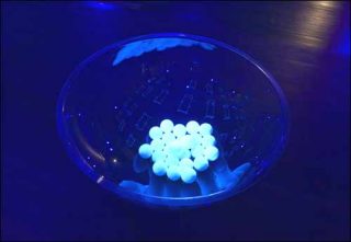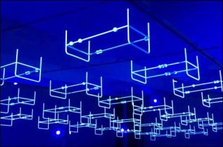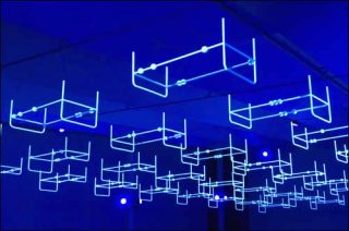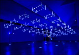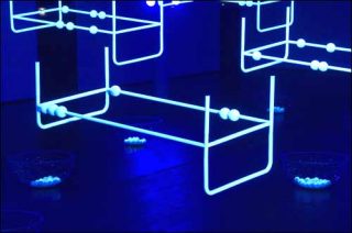 L’installation de Claude Lévêque se déploie d’un seul tenant sur les 1350 m2 consacrés aux expositions temporaires. L’espace a été entièrement obscurci pour l’occasion. Les éléments sculptés se révèlent en blanc phosphorescent sous l’effet d’une lumière noire: au plafond, une série d’armatures de lits, renversées et régulièrement suspendues, sur un plan légèrement incliné; au sol, une série de larges vasques transparentes contenant des boules blanches qui font écho à d’autres, enfilées comme des perles ou les boules d’un boulier, sur les traverses des lits du plafond.