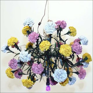 Ce titre porte en lui l’enjeu même de l’exposition : rassembler des artistes dont la démarche créative repose sur l’appropriation d’éléments préexistants, sur les emprunts, et la récupération. Le lustre Carnation Chandelier de Scoli Acosta, est semblable à un bouquet d’œillets multicolores suspendu dans l’air. Muni d’éléments de lampe, il produit une lumière rose visible entre les fleurs de papier. L’association des éléments floraux au dispositif électrique dépasse la dimension décorative pour renvoyer à d’évidentes préoccupations environnementales autour de la consommation d’énergie.