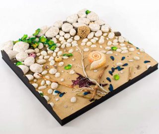La sculpture Spiaggia con Nautilus de Piero Gilardi est un exemple des « tapis-nature » qui rendirent célèbre cet artiste emblématique du courant de l’Arte Povera. Reproduisant en mousse polyuréthane des éléments naturels (ici un bord de mer avec sable, coquillages, végétaux et galets), ces œuvres s’intéressent à l’introduction de la nature dans l’espace domestique et au rapport entre l’art et la vie. Les côtés tranchés nets des tapis nature renvoient également à la production industrielle, mettant en perspective nature et artifice.