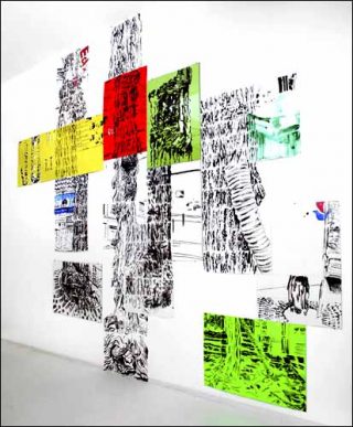 La linéarité n’existe plus: regarder est choisir. De multiples compositions, alors, s’offrent. Ne regarder que les surfaces vitrées. Passer de l’une à l’autre. Puis, parce que glissé en dessous d’une vitre, l’orange d’une feuille capte le regard, une autre lecture s’amorce. Ainsi des successions de narrations sans finalité s’enchâssent. Il y a là d’immenses dessins interconnectés desquels la taille serait, à chaque fois, le mur entier.