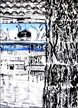 Dessins à l’encre de chine de paysages urbains. Les noirs et les blancs sont ponctués d’aquarelles colorées. À chaque feuille correspond un paysage urbain. Chacun d’eux comprend une grille sous-jacente, réseau de construction, qui supporte et dissèque. En récurrence dans chacun de ces paysages urbains, un arbre. Un signe, et surtout le dessin d’une matière: l’arbre en tant que rythmie d’un environnement visuel quotidien. Son surgissement abrupt dans un espace urbain le rend, ici, repère.