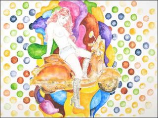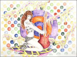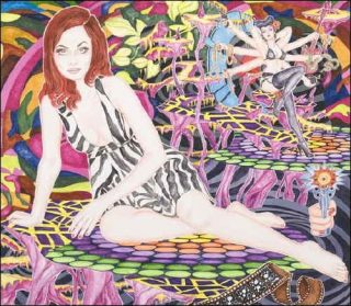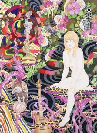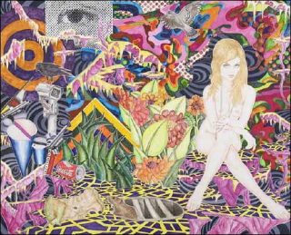 Par une savante imbrication de formes et de couleurs, les différentes figures sont ramenées au premier plan: point d’échappatoire dans ces toiles saturées où le vide, et non point le néant, ne trouve pas sa place. Pin-up plus ou moins dénudées, guitares, synthés, pellicules photos mais aussi rats, pigeons, canettes de coca jonchent ainsi l’espace pictural, sans grande cohérence apparente.