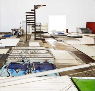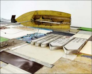 Le poids que la main supporte, œuvre créée in situ, résulte d’un procédé de collecte à travers Marseille mis en place en amont du montage de l’exposition. Il aura fallu traquer les mis-au-rebut, les délaissés, les prêts-à -jeter, disséminés dans les marges et les friches de la ville, et sélectionnés pour leur potentiel narratif ou leur typologie formelle ou fonctionnelle. Composée d’éléments exclusivement métalliques, l’installation recompose ainsi un espace résonnant et praticable à partir d’éléments rudimentaires tels qu’un panneau de signalisation, une couscoussière, une barge, une porte de garage, un radiateur de climatisation, ou un escalier.
