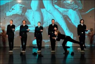 Cʼest ce à quoi sʼemploient les interprètes qui vont aux limites de lʼépuisement physique, exténuant dans dʼinnombrables répétitions les noms de pièces, dʼauteurs, de dates sur lesquels sʼarqueboute lʼhistoire de la représentation. Ils sont en uniformes, costumes cravates, nus, portent des couronnes dorées sur la tête, courent comme des dératés, halètent comme des chiens. Ils ressuscitent avec un zeste de perversité un théâtre muséifié qui nʼautorise aucune transgression. Et ce faisant, ils lʼachèvent dans un geste total mêlant vidéo, corps, texte et musique. Du conflit ainsi activé entre passé et présent émerge une forme qui ne doit quʼà elle-même sa légitimité. Une forme tourbillonnante dont on sort droit comme un i, avec la certitude que nos pendules internes viennent dʼêtre remises à lʼheure.