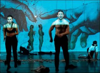 L’émancipation dans la douleur de ces dispositifs de pouvoir justifie chez Fabre le recours à une esthétique de l’excès, chaque tableau poussant à son paroxysme les situations jusqu’au seuil du supportable. Du poétique au violent, du sensuel à l’érotique, du drôle à l’éprouvant, Jan Fabre trace des voies de bascule entre des affects extrêmes, comptant sur la performance des comédiens et l’endurance du spectateur. La (très) longue course sur place, jusqu’à l’épuisement non feint des acteurs, rouges et haletants, ou celle, plus traînante encore, où quatre couples revivent incessamment la même scène nécrophile (la mort de la fiancée, le baiser de son amant, la résurrection, l’abandon, et ainsi de suite) en disent long sur la vision désublimée que porte Jan Fabre, et sur les innombrables contradictions qui se dressent face à sa prétention à être l’«ange de la beauté».