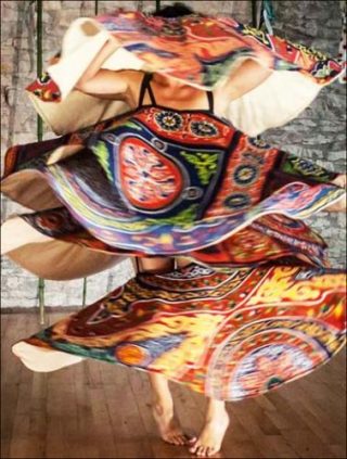 Comment nommer toutes ces douleurs héritées ? Comment venir à bout de la tragique fatalité des conflits, des contraintes sociales et morales ? C’est ce cycle dramatique, cette roue infernale, qui se dévoile lors d’une danse giratoire soufie. En derviche tourneur, la danseuse révèle au fur et à mesure la nudité de son corps se libérant de ses sept jupes à volants étagés. Les motifs fleuris s’éparpillent au sol. Son corps nu tombe, ivre. Le printemps est là , étourdissant. Les barrières s’affranchissent dans cette esthétique colorée mêlant pulsion et émerveillement.