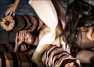 Le rideau s’ouvre alors sur la perception sensuelle d’un harem. Allongés sur des traversins, à moitié dénudés, lentement les corps s’éveillent. Sous une veilleuse, le rythme s’apaise et le regard se transforme face à ses beautés évanescentes.