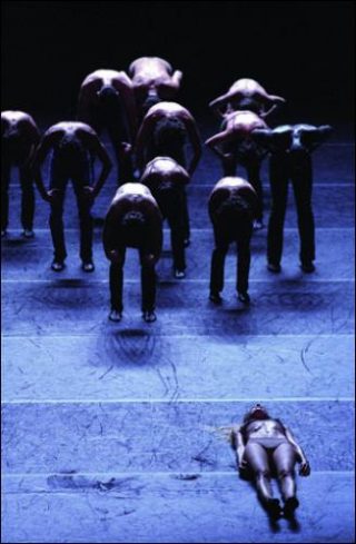 Le choix de faire du Sacre une sorte de L’homme à la tête de chou II pose problème, dans le sens où la partition stravinskienne, puisant son inspiration dans les forces vives des entrailles telluriques qui accouchent du printemps, se fond bien mal dans cette nébuleuse atmosphère bleu pétrole. Comme avec le personnage de Marilou, Gallotta fait le choix de diffracter la figure de l’Elue à travers toutes ses danseuses dites «éligibles». Mais alors que ce parti pris se justifiait pleinement lorsqu’il s’agissait de plonger le spectateur dans les oniriques méandres de l’imagination de Gainsbourg, il semble ici bien moins pertinent. Sans Elue, vecteur de la tragédie donnant sens à la musique originelle, le ballet n’a de «sacré» que le nom. L’imbroglio de gestes enfiévrés, éclaté en tous points de l’espace et ne se recentrant que ponctuellement sur quelques — au demeurant très beaux — solos ou duos, finit par n’évoquer que les vaines gesticulations d’une danse macabre. Sur l’autel de la dansité compulsive, c’est la densité significative qui semble être sacrifiée. La performance physique des danseurs est certes admirable, mais là où une Pina Bausch savait nourrir la vigueur corporelle d’une flamme profondément intérieure, Gallotta ne nous offre que de superficiels feux follets, agitation aussi exacerbée que vide de sens.