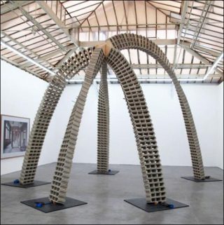 Cette transcendance des contraintes physiques est particulièrement sensible dans la série des Caténaires, ces vertiges de parpaing qu’il développe avec une extrême concentration portée sur le geste. Pour faire tenir ces arches autoportantes, Vincent Ganivet reprend la formule de la chaînette, une équation traditionnelle utilisée par GaudÃ, et il y allie des techniques de construction ancestrales (cintres, leviers et pierre sèche) sur le mode intuitif du bricoleur passionné par la mécanique des forces. Pour mieux pousser le système dans ses retranchements, l’artiste élève toujours plus haut ses trajectoires, les distord ou les précarise jusqu’à éprouver les limites: en 2011, à la Kunsthalle de Karlsruhe, une sculpture à cinq pieds et clef de voûte s’effondre pendant l’exposition.