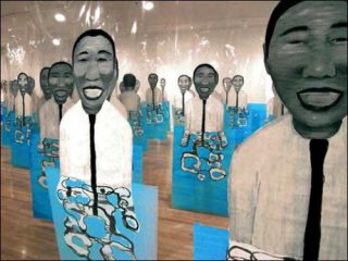 Aller dans l’exposition comme on va dans la vie du peintre. En haut, la vie publique, les expériences politiques, la guerre, son absurdité, sa logique, les attitudes de façade, les faux sourires vides que l’on adresse à la face du monde. Le calme du bleu anesthésie le corps qui se délite, sans douleur, sans conscience de disparaître. L’important n’est-il pas de toujours sourire? Il est dit ici que par manque de vigilance, on se perd.