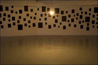 De très nombreux cadres, aux formats différents, sont accrochés au mur. Ces sous-verres, ces miroirs noirs, comme les appelle l’artiste, se donnent à voir comme des photographies, mais elles ne montrent rien, sinon la profondeur de leur surface noire et le reflet sur les vitres de la lumière de l’ampoule et de l’espace environnant. Le portrait est impossible. Pour être, il ne peut que montrer de l’invisible à travers les multiples reflets du monde des apparences.