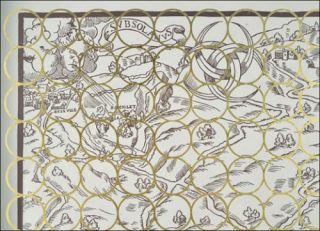 Le plan de Paris de Truchet et Hoyaux révèle les prémisses de l’organisation concentrique de la ville qui, telle un oignon, se replie couche après couche sur elle-même. Avec Le Grand Renfermement, Nicolas Milhé renforce le sentiment de prison dorée en parant le plan du XVIe siècle d’un motif de cercles dorés à la feuille qui n’est pas sans rappeler les blasons de l’industrie du luxe.