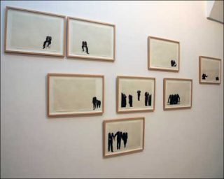 Et, si Julien Bismuth insuffle la vie à de simples choses, il la retire en revanche aux êtres prétendus animés. A l’intérieur de huit petits cadres, l’artiste a découpé et collé des photos d’hommes d’affaires sur des feuilles de papier blanc. Toutes les têtes ont été retirées : des corps acéphales vêtus de costards marchent, semblent disserter, réajustent une cravate. Ainsi, sans visages, les personnages sont identiques les uns aux autres car dénués d’individualité et de subjectivité. De fait, ils sont ironiquement réduits au statut de machine.