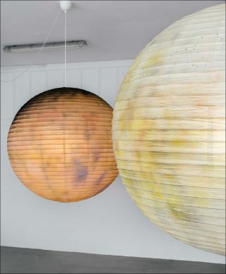 Au second étage, Mai-Thu Perret plante un nouveau décor. Le visiteur lève cette fois les yeux au plafond d’où sont suspendues des boules japonaises en papier, peintes par l’artiste pour former un ciel parsemé de nuages et de lunes. Mais ce paysage céleste est poétique répond d’une scénographie électrique, à la faveur d’une nature là encore muséalisée. Cet espace accueille également une sculpture en céramique en forme d’interprétation abstraite du bâtiment de la scène nationale du Havre — Le Volcan ––, réalisé par l’architecte et designer brésilien Oscar Niemeyer en 1982. Cette recréation du monument renvoie au chantier de rénovation de l’édifice qui s’est déroulé entre 2011 et 2015. Plus encore, « l’intimité et la chaleur [de la] lumière artificielle » de l’environnement ne sont pas sans rappeler celle qui chaque nuit éclaire le Volcan de l’intérieur.