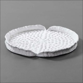 Au premier étage, dix grandes feuilles de nénuphars en céramique sont dispersées au sol comme sur l’eau dormante d’un étang. Inspirées des nénuphars géants d’Amérique du Sud, ces réalisations renvoient également aux Nymphéas de Claude Monet. À la différence de son aîné, Mai-Thu Perret ne s’attache pas à retranscrire l’impression visuelle que permet leur observation réelle. Par le biais d’une multitude de couleurs, elle souligne l’artificialité de leur représentation en recourant à une technique autrement plus ancienne : la céramique. Comme l’indique le rideau de scène présent dans l’exposition, Mai-Thu Perret fabrique et façonne une nature factice dont elle souligne l’inévitable mise en scène.