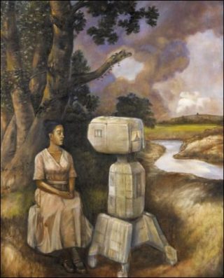 Cette exposition repose sur des allégories qui sont le fruit de nouvelles relations entretenues entre le Temps et l’Histoire. Andrew Lewis conjugue l’histoire et l’évolution au même temps. Prenons par exemple la peinture Chez Elizabeth Wydville, la jeune femme, une descendante de la première femme roturière à avoir épousé un monarque anglais (Edward IV de la Maison d’York), est confortablement assise dans un paysage aux allures bucoliques, sorte de nouvelle Arcadie; elle regarde une sculpture pour le moins étrange voire anachronique, sculpture dans laquelle se trouve une petite fenêtre. L’anecdote ne s‘arrête pas à la simple mise en parallèle de l’évolution morale de la monarchie anglaise, de l’évolution des mœurs, de la technologie, c’est une sorte de mise en abîme de l’histoire qui sert à nous montrer l’évolution universelle tout en insistant sur le caractère invariable de certaines qualités, certains épisodes.