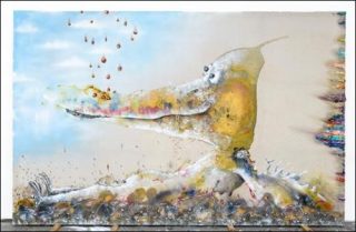 Des romans graphiques au dynamisme intense qu’on pourrait insérer parmi les œuvres d’une généalogie d’artistes singuliers, de Jean Dubuffet à Wangechi Mutu, en passant par Dado. D’où les contrastes entre les larges espaces de la toile laissée brute et les excès de dépôt des masses de matières. D’où les récurrences des éléments convoqués: des oiseaux, des fraises, des pommes, des bougies, des mains et puis surtout des visages aux yeux disproportionnés et aux bouches grandes ouvertes.