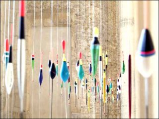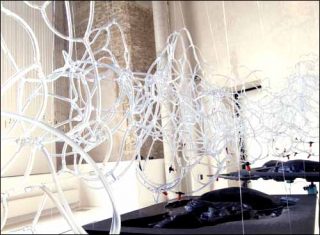 Des lacs se forment, des rivières aussi, l’eau circule d’un canyon à l’autre, s’infiltre dans le sol et retourne en pluie. C’est une machine à faire la pluie par beau temps, c’est un instrument à eau, une sorte de réplique écourtée du cycle de l’eau. C’est aussi une ligne d’eau, une ligne de flottaison, une vaguelette de pêcherie, une ondulation de bouchons, un orgue de notes colorées et suspendues.