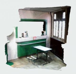 La caméra de console de jeu elle aussi est dotée d’un capteur infrarouge mais pour scanner en 3D. Elle sert habituellement à détecter le corps d’un joueur qui bouge devant la télé pour reproduire ses mouvements au sein du jeu. Associée à un logiciel adéquat, elle scanne et transmet des fragments d’espace, des objets ou des bouts d’architecture : guichets, coins de salles, néons… Tous flottant dans la page. Ils ont l’air d’avoir été dessinés, de sortir d’un croquis préparatoire à une huile sur toile. Les contours sont francs mais la matière s’étiole par endroits, laissant apparaître par transparence le fond de l’image. L’empreinte du décor des PMU devenue fragile, instable, évanescente.