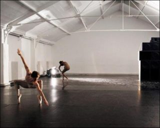 Il vient se placer en avant-scène et monte sur ses pointes sans lacets —dépouillées justement de leur liens—, la semelle un peut dure et non assouplie par le travail à la barre : un chausson qui ne se fait pas le prolongement du pied mais s’assume en tant qu’objet de travail. Jambes écartées, genoux fléchis, buste penchés vers l’avant et lombaires suffisamment cambrées pour mettre en valeur les fessiers, la posture est tenue immobile à la fois académique et sexy, raffinée et sobre. Le justaucorps couleur chair ne cache rien tout en abolissant une nudité qui est hors propos, rend visible l’effort du corps qui se hisse sur ses extrémités et reçoit les vibrations terribles du Sound System. Exercice d’équilibre intense, de concentration qui lentement va se déployer vers une danse joyeuse.