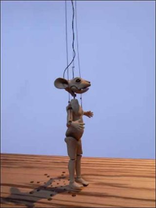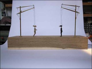 Une marionnette invective un sac qui se gonfle tant bien que mal pour émettre des sons tandis qu’une autre s’adresse d’un ton sentencieux à une ceinture de métal.