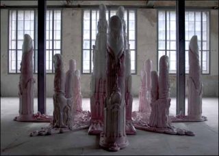 C’est ainsi que se déploient, dans ses constructions, des surfaces vertes, blanches, roses ou noires, comme dans WYZ 183 de 2006, où d’une architectonique rose, comme une peau au cours d’une mue, s’érigent verticaux et sortant de leur gangue, de monumentaux index blancs, doigts émaillés dressés vers le ciel, comme corps emmaillotés ou sexes dressés, dessinant une étrange architecture. Ici comme dans les autres sculptures, de façon récurrente, se produit une osmose entre corps et architecture, comme un état fusionnel, au sein d’une matière en fusion.
